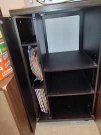 Anta in legno con scomparti per dischi, mensole spostabili.