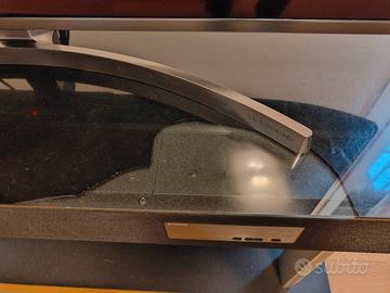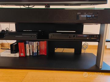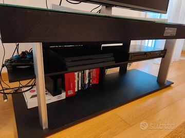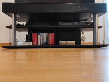Yamaha YRS-1000 perfettamente funzionante. Prodotto non comune e di alta qualità: mobile TV con diffusori integrati (1 subwoofer, 2 woofer, 16 speaker) per non riempire la stanza di casse. Dotato di telecomando e microfono per la mappatura iniziale della stanza, grazie a cui i diffusori utilizzeranno le pareti per ricreare l'effetto surround. Dotato di diversi ingressi per collegare TV e altre sorgenti: HDMI, Coassiale (regalo il cavo), Ottico, Jack audio. Struttura robusta e ben rifinita, usato con cura, suono potente e bassi profondi. Unico difetto: manca una piccola zona della copertura del vetro (vedi ultima foto), ma si tratta di una pellicola che si può togliere o sostituire facilmente. Dimensioni in cm: L 116 - H 50 - P 41,5