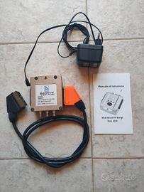 Telewire TW-2036 AV-TM01, unmodulatore RF stereo. Questo apparecchio serve a convertire un segnale audio/video (che solitamente entra tramite il connettore SCART arancione visibile a destra) in un segnale a radiofrequenza (RF). In parole povere, permette di visualizzare il segnale di un vecchio decoder, videoregistratore o telecamera su uno o più televisori collegandoli tramite il normale cavo dell'antenna (cavo coassiale). Fornito con manuale di istruzioni, alimentatore 12V, cavo scart.