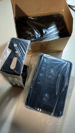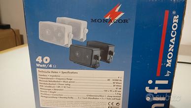 Coppia di casse acustiche universali a 2 vie. Contenitore nero di plastica con griglia frontale metallica. Dispositivo integrato per appendere le casse alla parete. Staffa di montaggio orientabile. Prezzo molto trattabile