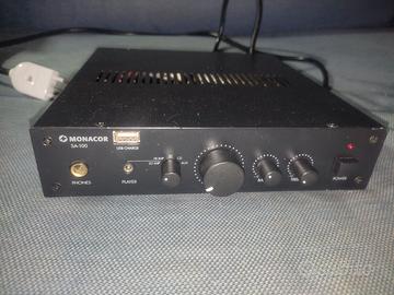 Vendo amplificatore Monacor SA-100. Esteticamente in discrete condizioni, però l'uscita audio non è buona, si sente una distorsione. Vendo dunque per essere riparato. Visto e piaciuto. Foto reali. Grazie.