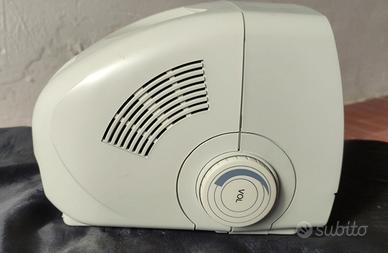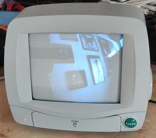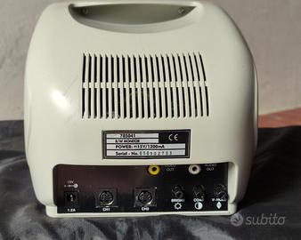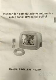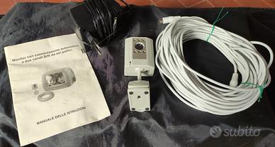 Mini sistema di sorveglianza / monitoraggio per ambienti chiusi basato su un monitor B/N a tubo catodico da 15 cm di diagonale (6"), con doppio ingresso audio/video, e da una mini telecamera con sensore CCD . I due componenti sono collegati fra loro tramite un cavo (in dotazione) della lunghezza di 18 metri. Il sistema è corredato da un alimentatore che provvede a fornire energia sia al monitor che alla telecamera. La telecamera acquisisce anche segnale sonoro che viene riprodotto dal monitor tramite un piccolo altoparlante integrato. Il sistema è utilizzabile per usi universali, per esempio: - per un piccolo impianto di sorveglianza con telecamera (max 2), - per monitorare una stanza con minori, - oppure in applicazioni multimediali. Il sistema è testato e funzionante, le condizioni estetiche sono ottime e comprende i seguenti componenti: - monitor - telecamera - cavo collegamento - alimentatore - libretto istruzioni in Italiano/Inglese Queste le caratteristiche tecniche principali: Tubo catodico: . . . . . . . B/N, 15,2 cm (6") Diagonale schermo: . . . 13,5 cm (5,3") Risoluzione: . . . . . . . . . 420 linee Sincronizzazione, commutabile fra : CCIR: . . . . . . . . . . . . h. 15 625 Hz, v. 50 Hz EIA: . . . . . . . . . . . . . h. 15 750 Hz, v. 60 Hz Ingresso video: . . . . . . . 1 Vpp/75 Ω, RCA Potenza uscita audio: . . 0,5 W Temperatura d'impiego: 0 – 40 °C Alimentazione: . . . . . . . 13,5 V /850 mA tramite Dimensioni: . . . . . . . . . . 190 x 155 x 210 mm Spedizione con imballo accurato.
