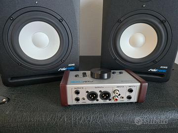 Monitor da studio biamplificato 60W - 5" con controller dedicato M-Control+. Vendo per inutilizzo - Ottimo stato,come nuove. Power: 60 Watt Bi-Amplified (40 + 20 Watts) Class AB amplifiers Woofer: 5.25" Natural silk tweeter: 0.75" Frequency range: 55 - 20,000 Hz Crossover frequency: 2700 Hz Signal-to-noise ratio > 95 dB (type A-weighted) Input impedance: 20,000 ohm balanced / 10,000 ohm unbalanced Inputs: XLR balanced 6.3 mm jack balanced, RCA connector unbalanced Status LED Standby function Housing made from MDF with vinyl lamination Dimensions (WxHxD): 185 x 278 x 200 mm Weight: 4.6 kg