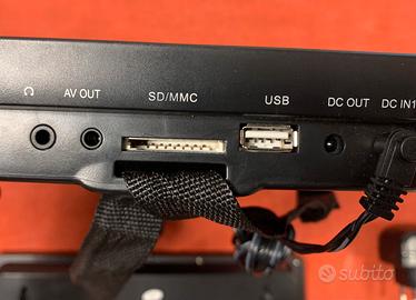 Vendo coppia monitor per poggiatesta autovettura con relative cinghie per installazione utilizzabili anche in abitazione in quanto sono dotati di alimentatore per 220v oltre di quello 12v per accendisigari. Il monitor master è dotato di lettore DVD e di sua batteria interna. Oltre al DVD è possibile poter vedere film o video anche su chiavetta USB o scheda SD/MMC. Il secondo monitor riproduce audio e film che si vedono sul monitor master. (per funzionare secondo monitor deve essere alimentato dall’alimentatore per auto o dall’alimentatore per la casa in quanto la batteria del master non alimenta il secondo monitor). Entrambi hanno le casse audio oltre all’uscita auricolari/cuffie.