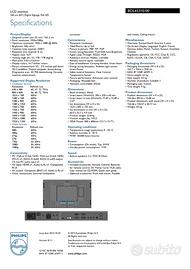 Monitor 1920x1080p – (WxHxD) 152x89x12,5 – PESO 54 KG. Connessioni VGA-in D-Sub 15HD, VGA-out D-Sub 15HD, DVI-D x1, RS232 D-Sub-9, RS232 D-sub9 output, 3.5 mm PC audio input x1 – AV input HDMI x1, Audio (L/R) x1, Component RCA – AV output Composite (BNC) x1, Audio (L/R) x1. Caratteristiche e specifiche nel datasheet allegato nelle foto. Buono stato generale e perfettamente funzionante. NO SPEDIZIONE solo ritiro in Milano zona nord.