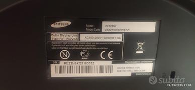 Monitor Samsung SyncMaster 2232BW perfettamente funzionanote. Dimensioni diagonale schermo: 55,9 cm (22"), Risoluzione del display: 1680 x 1050 Pixel. Tipologia display: LCD. Tempo di risposta: 2 ms, Angolo di visualizzazione (orizzontale): 170°, Angolo di visualizzazione (verticale): 170°. Colore del prodotto: Nero.Possibilità di provarlo.