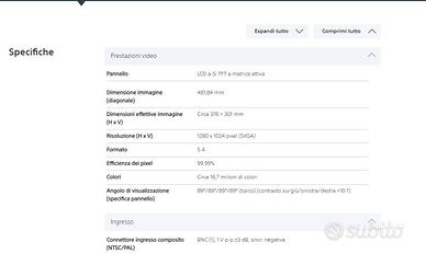 Monitor SONY LCD SXGA medicale da 19" LMD-1951MD è progettato per i sistemi SD (Definizione Standard) e HD (Alta Definizione) che generano un segnale di uscita con rapporto di formato di 4:3/5:4. LMD-1951MD presenta numerose caratteristiche e funzionalità del modello LMD-2451MD, fra cui l'elaborazione del colore ChromaTRU™ per un'eccellente riproduzione delle immagini, il processore del segnale completamente digitale a 10 bit per produrre immagini precise e realistiche e avanzate modalità di visualizzazione, come ad esempio Picture-in-Picture e immagine speculare. Presenta un piccolo segno nella parte destra- centrale ma che non ne compromette la visualizzazione. Ingressi Svideo/Composito/RGB/VGAe DVI. Completo di cavi e manuali. No offerte assurde o perditempo.