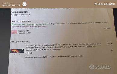 Vendo monitor TITAN ARMY, monitor da gioco curvo di 49 pollici,144 hz, DFHD 3840x1080 CSOT HVA, schermo curvo 1800 32:9, 1ms, 127% sRGB, adattive-sync, HDTV + display Port, RJ45, basso livello di luce blu, supporto VESA, per FPS, MOBA, RTS, MMORPG il monitor puo' essere regolato in altezza e curvato verso desta o sinistra. Premetto che il monitor e' in condizioni eccellenti, nessun graffio o crepa e funzionante. fornisco scatola originale. per ovvi motivi non posso spedire. capisco che le immagini sono poche perche' il monitor e' ancora sulla scrivania. per ulteriori informazioni chiedete. solo interessati. no perditempo, non rispondo. grazie.