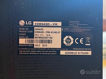 Vendo Monitor/TV LG 22'', modello 22MN43D-PR con telecomando originale.