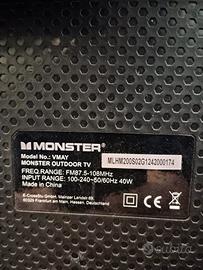 TV da esterno con immagini e audio straordinari Monster VMay è dotato di uno schermo Full HD da 15,6 pollici e pannello IPS, che offre immagini realistiche e una riproduzione fluida. Grazie alla potenza audio di 60 W, potrai percepire ogni suono, ogni sussurro e ogni esplosione intorno a te. Immergiti in immagini straordinarie e audio potente. Vivi un'incredibile esperienza visiva all'aperto con Monster VMay TV. Lunga autonomia e design impermeabile IPX4 per un divertimento all'aria aperta che dura tutto il giorno Con una batteria da 12 V/9 A, Monster VMay TV supporta 25 ore di riproduzione audio o 8 ore di riproduzione video con una singola carica, per un intrattenimento senza interruzioni. La sua resistenza all'acqua IPX4 garantisce che la pioggia non interrompa la tua musica. Visione in diretta senza interruzioni e mirroring dello schermo Monster VMay ti consente di guardare emozionanti eventi sportivi in diretta, programmi TV online, film, ecc. tramite Fire TV Stick, Android TV Box o TV Tuner Antenna. Puoi anche sbloccare la magia dello screen mirroring e goderti uno schermo più grande sulla TV. Non perderti l'azione: inizia lo streaming oggi stesso! Questa TV da esterno vanta la connettività Bluetooth 5.3 per una riproduzione audio impeccabile. Con ingressi MIC e AUX da 3,5 mm per cantare e suonare la chitarra, due porte HDMI per una riproduzione video cristallina, un'uscita di ricarica USB 5V/2,1A e una porta USB-A per la lettura di chiavette USB e la ricarica di dispositivi, questa TV è il centro di intrattenimento definitivo per tutti i tuoi desideri audio e video! La Monster VMay TV è la compagna ideale per l'intrattenimento all'aperto, con un peso di soli 7,912 kg e una sicura maniglia antiscivolo. Interfaces 2 x HDMI 1 x USB Output (5V 2.1A) 1 x USB-A 1 x Aux (3.5mm) 1 x Mic/Guitar Input (6.35mm) 1 x TV Antenna Port 1 x AC Input 1 x DC Input Power Input: AC 120V-240V Power Consumption: 0.561 Battery: 12V, 9A Charging Time: Approx. 6 Hours