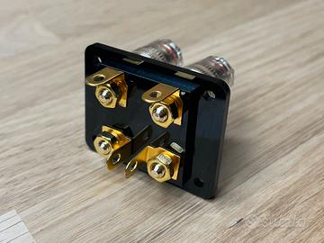 Questa che ho realizzato (in materiale acrilico con taglio laser) è la soluzione che permette la connessione con cavo spellato, terminale a forcella e spine banana da 4mm