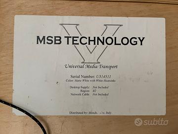 MSB Technology Universal Media Transport con Dual Power Base. Finitura silver. Condizioni assolutamente perfette, pari al nuovo, 10/10 grading. Imballi originali, manuali, telecomando. Importazione italiana Mondo Audio. Listino italiano 14.950 euro.
