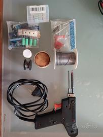 In blocco vendo per cessata attività multimetro analogico Lafayette modello 7005 perfettamente funzionante completo di custodia azzurra, saldatore automatico Ewing doppia potenza riscaldante con rotellina stagno che avanza con pulsante, completo di vari ricambi e doppio rocchetto per stagno.