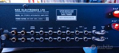 Metto in vendita il mitico NAD 304. Per chi non lo conoscesse, è l'erede migliorato del celebre 3020, con una costruzione più robusta e una sezione finale capace di gestire carichi difficili grazie alla tecnologia Power Envelope. L'amplificatore è in ottimo stato controllato e pulito internamente (potenziometri senza fruscii). Disponibile a prova di ascolto e a spedire con imballo professionale. NAD 304 è un amplificatore integrato leggendario tra gli appassionati di Hi-Fi, noto per la sua musicalità e la capacità di pilotare anche diffusori difficili nonostante i "soli" 35W dichiarati. Specifiche principali: - Potenza d'uscita: 35 watt per canale su 8Ω (stereo) -Sezione Pre e Finale separabili (ponticelli posteriori presenti). -Ingressi: Video Sound, Phono, CD, Aux, Tape1, Tape 2, Tuner -Risposta in frequenza: da 3Hz a 70kHz -Distorsione armonica totale: 0,03% -Fattore di smorzamento: 100 -Sensibilità d'ingresso: 2,5mV (MM), 165mV (linea) -Rapporto segnale/rumore: 77dB (MM), 106dB (linea) -Controllo Bassi e Alti -Selettore “Tone defect” -Possibile collegare doppia coppia di casse ( A+B) -Funzione Soft Clipping selezionabile tramite selettore posteriore -Misure; Larghezza: 420 mm, Altezza: 108 mm, Profondità: 320 mm -Peso: 6,4 kg