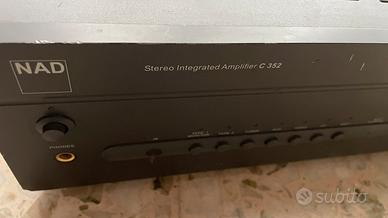 Nad c352 compreso di telecomando NAD casa che non ha bisogno di presentazioni di cui sono un amante con la possibilità di usarlo come preamplificato suono di buonissima qualita premiato come miglior amplificatore sotto il costo 730€ a 8 omm watt 80 ma molto molti di piu secondo … me ottima spinta bassi corposi suono dettagliato qualche piccolo segno di usura ma per il resto perfetto al 100% vendo causa cambio sitemazione in casa …mobili nuovi lite con pa