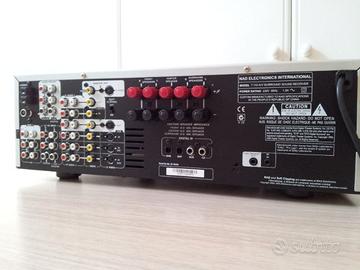 Vendo impeccabile Nad T 742 colore Titanio completo di scatola originale e manuale installazione, sistema 5.1 Dolby Digital Surround + DTS con ricevitore radio RDS, Descrizione: -50W x 5 di potenza continua su 8 ohm, tutti i canali in funzione - 90/130/175W di potenza dinamica su 8/4/2 ohm - Fino a 28 ampere di corrente in uscita - Decoder Dolby Digital e DTS integrati - Dolby ProLogic II - Processore DSP Crystal - Convertitori Sigma - Delta A/D e D/A Crystal con risoluzione 96kHz/24 bit - Ingresso 5.1 per decoder esterno - Uscite pre per tutti i canali (5.1 out) - 5 ingressi Video, CD, Tape; 2 uscite Video, tutte S-Video e Composite - 3 ingressi S-Video; 1 uscita S-Video; uscita S-Video Monitor - 4 ingressi digitali: 2 coassiali, 2 ottici (fibra ottica) - Modo surround EARS (Enhanced Ambience Recovery System) - Tuner RDS (PS e RT) 30 preselezioni, Soft Clipping - Telecomando di sistema - NAD Link - Manuale d'uso. Impeccabile, perfetto, disponibile per qualsiasi prova.