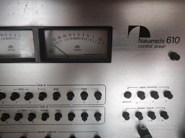 Splendida accoppiata vintage Nakamichi composta dal preamplificatore/mixer 610 e dal finale di potenza "Slim Line" 420. Un sistema che unisce la versatilità di un mixer professionale alla musicalità di un finale in Classe B ad alta efficienza. Nakamichi 610: Analizzatore di fase, generatore di toni di test e VU-meter funzionanti. Ideale per gestire più sorgenti (anche microfoniche). Nakamichi 420: Finale compatto da 50W per canale, capace di pilotare con disinvoltura anche diffusori impegnativi. Entrambi i componenti sono stati testati. I pre ha solo bisogno di una ripassata con disossidante per contatti visto che è fermo da moltissimo tempo. Vendo preferibilmente in coppia per preservare l'integrità del sistema originale Disponibile per qualsiasi prova d'ascolto presso la mia abitazione. Data la delicatezza e il peso , preferisco il ritiro a mano