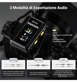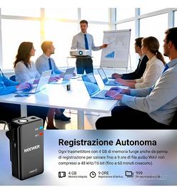 Vendo NEEWER CM28 (1 RX + 2 TX + custodia ricarica), microfono lavalier wireless,Anti Rumore, registrazione non compressa a 48 kHz/16 bit per 9 ore, portata 200 m, Compatibile con iPhone/Android/ Fotocamere di tutte le marche. Prestazioni pari ai Dji Mic