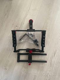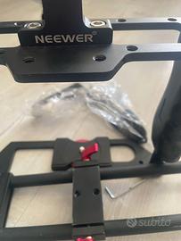 Gabbia per videocamera riprese marca Neewer in lega d'alluminio con maniglia soprastante + rig completo per lenti zoom e barra applicabile alla gabbia per applicazione di ulteriori accessori. Fornito di tutte le viti e i materiali in condizioni perfette.