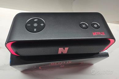 Cassa Netflix Portable Bluetooth Speaker Design Iconico: Logo "N" sulla griglia frontale e scritta Netflix sulla parte superiore.