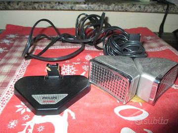 Nr. 2 microfoni vintage originali: il 1° è un Grundig GDM 305 anno 1968 ancora in confezione propria E 20; il 2° è un microfono stereo Philips N8402 anno 1974, da riparare il sostegno E 30. Disponibili, per inutilizzo, altri riproduttori audio e video vintage analogici e 1 macchina fotografica e 1 videocamera digitali, 1 proiettore Cabin All-8 anni 60 con scherno e alcuni filmini, alcuni accessori e pubblicazioni anni 2000 per computer, alcuni telefoni analogici anni 60-70-80 e digitali anni 90-2000, 1 centralino telefonico Allocchio Bacchini degli anni 40