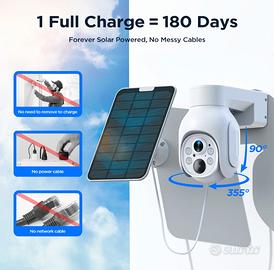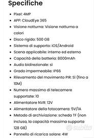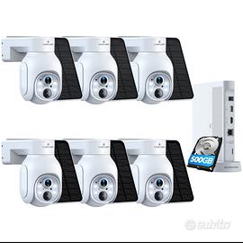 Set completo di 6 telecamere di video sorveglianza wireless a batteria con pannelli solari(inesauribili ) con slot per SD di memoria + storage da 500Gb di memorizzazione , tutto ancora imballato e nuovo