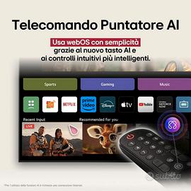 SPEDIZIONE GRATUITA IN TUTTA ITALIA Processore AI α8 Gen2: ottimizza immagini e contenuti in modo intelligente per una resa più profonda, dettagliata e coinvolgente. Nero perfetto e colori brillanti: tecnologia OLED 4K con contrasto elevato, neri profondi e colori vivaci e accurati. Smart TV webOS con AI: accesso rapido ai contenuti, ricerca intelligente e aggiornamenti garantiti con webOS Re:New. Audio e video ottimizzati: AI Upscaling, mappatura dinamica dei toni e AI Sound Pro per immagini più definite e suono immersivo. Perfetta per il gaming: 4 HDMI 2.1, 4K a 120Hz, VRR, G-SYNC e FreeSync per un gameplay fluido e reattivo. Dolby Vision e Dolby Atmos: qualità cinematografica per immagini spettacolari e audio più coinvolgente. Design slim: elegante e moderno, ideale per valorizzare ogni ambiente.