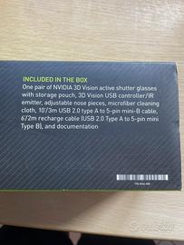 Un paio di occhiali attivi NVIDIA 3D Vision con custodia, controller USB 3D Vision/emettitore IR, naselli regolabili, panno di pulizia in microfibra, cavo da 10'/3m USB 2.0 tipo A a 5 pin mini-B, cavo di ricarica da 6'/2m (USB 2.0 tipo A a 5 pin mini tipo B) e documentazione