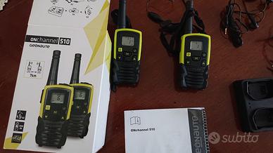 Walkie Talkie On Channel 510 Decathlon vendo per non-uso, usato solo 2 volte perfettamente funzionante 8 canali e 38 sotto canali display illuminato come a foto 2 walkie talkie, caricabatterie, alimentatore usb, 2 headset con microfoni