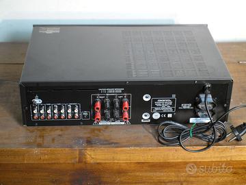 Potenza assorbita in esercizio:160 Watt, Tipo connettore:1 x cuffie ( jack stereo da 6,3 mm ) - frontale 1 x ingresso audio giradischi ( Fono RCA x 2 ) - posteriore 4 x ingresso linea audio ( Fono RCA x 2 ) - posteriore 2 x uscita linea audio ( Fono RCA x 2 ) - posteriore 4 x uscita altoparlanti ( banana/spade x 2 ) - posteriore 1 x telecomando - posteriore, Jack cuffie: Sì, Colore rivestimento: Nero. Caratteristiche aggiuntive: Commutatore altoparlanti A/B/A+B, Wide Range Amplifier Technology (WRAT), predisposto per iPod, Risposta in frequenza:10 - 100000 Hz, Distorsione armonica totale:0.08%, Modalità uscita audio: Stereo, Sensibilità di ingresso:150 mV, Dettagli uscita amplificatore:65 Watt - 4 Ohm - a 1 kHz - 2 canali, Comando toni alti:Sì, Controllo dei bassi:Sì, Effetti audio:Loudness, Rapporto segnale/rumore:100 dB, Impedenza di ingresso:50 kOhm