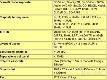 È un lettore multiformato hiend della massima qualità costruttiva e sonica in grado di leggere tutti i formati fisici come cd, sacd, dvd, bluray con upsampling 4K. E’ anche un player in grado di leggere tutti i formati digitali fino a 192kb. È un Dac di elevatissima qualità dotato di conversione ESS sabre. Uscite bilanciate e sbilanciate. Innumerevoli connessioni con Tv ed eventualmente con impianti Home theatre. Impossibile elencare tutte le funzioni. Dotato di telecomando originale oltre ad un secondo telecomando clone.