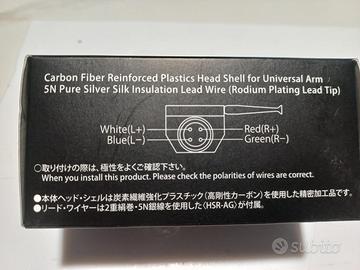 In vendita prestigioso headshell oyaide HS-CF, in fibra di carbonio, connessioni rodiate e cavi in argento isolati in seta. Confezione mai aperta e mai utilizzato. Prezzo del nuovo oltre 300 euro. Questo è il miglior porta testina per i bracci Sme, jelco, fidelity reserarch, ikeda, saec, ortofon, microfono seiki, stabile glanz, sony.