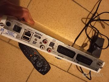Si collega al TV sfruttando l’uscita HDMI e per chi dispone di un sistema Home Theatre è possibile collegarlo attraverso le uscite audio digitali (ottica o coassiale) in modo da poter ascoltare i programmi trasmessi con la qualità audio Dolby Digital 5.1. Uscite: HDMI x 1; Scart x 2; Audio digitale coassiale RCA x 1; Uscita audio ottica digitale x 1; Audio R+L x 2 RCA; Presa Ethernet RJ-45; USB 2.0 tipo A; Presa telefonica RJ-11. Alimentazione 230Vca. Dim. 305x51x222mm