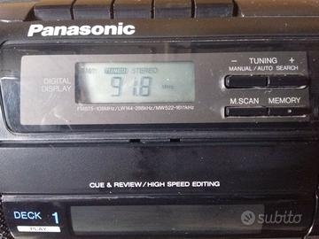 Radioregistratore portatile stereo Panasonic RX-FT600 dotato di ricevitore multibanda, FM stereo, preselezioni canali con display, equalizzatore 3 bande, tasto Bass-Boost, doppio lettore cassette (uno di questi registra), ingresso RCA e jack 3.5mm per collegare fisicamente lettore CD, iPod, smartphone, oppure altra fonte sonora.