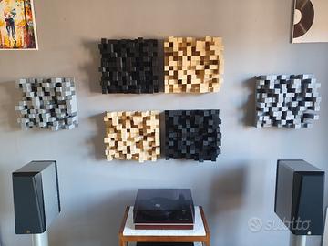 Pannelli acustici diffusori skyline 3d fatti da me, servono a rompere e ottimizzare le riflessioni della stanza. Misurano 45,5 cm X 42 cm X 14 cm, costruiti in plastica atossica peso 2 kg circa, dotati di 2 fori per essere appesi come quadri. Range di lavoro di frequenze da 900 hz a 5000 hz +-500hz.