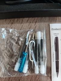 È dotato di una telecamera nascosta invisibile, ideale per registrare con discrezione riunioni, conferenze e altro ancora. La penna scrive in nero Include 1x scatola originale 1x penna spi 1x cavetto ricarica US 1x micro SD da 32 G 5x ricariche