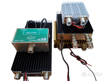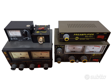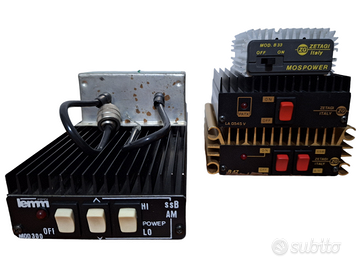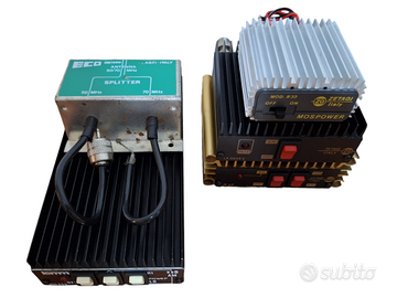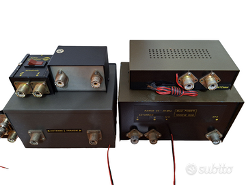 Accordatore completo di rosmetro wattmetro e deviatore commutatore di antenna ZG Zetagi Transmatch Mod. TM 1000 / TM-1000 / TM1000 per accordatura e taratura antenne CB HF con tenuta di potenza fino a 500W AM FM e 1000W SSB, per banda CB HF frequenza da 25 a 30 mHz, funzionamento da 11 a 15V, a 90 euro. Amplificatore lineare Lemm Mod300 / Mod 300 per banda CB HF frequenza da 25 a 30 mHz, eroga 150W in AM FM e 300 W in SSB, funzionamento da 12 a 15V, a 110 euro. Amplificatore lineare ZG Zetagi Mod LA0545V / LA 0545 V per banda VHF, frequenza da 140 a 160 mHz, potenza ingresso da 0.1 a 3 Watt, potenza uscita da 0.5 a 45 watt, funzionamento da 12 a 15V, dimensioni L120 x P130 x H44, peso 0.70 kg, a 60 euro. Preamplificatore di antenna Preamplifier ZG Zetagi Mod. P27-1 / P27 1 per banda CB HF frequenza da 25 a 30 mHz, funzionamento da 11 a 15V, a 40 euro. Rosmetro EuroCB / Euro CB SWR-420 per taratura antenne CB HF, a 20 euro. Splitter Duplexer Eco Antenne per unire o separare i 50 e i 70 mHz (6 e 4 metri), a 20 euro.