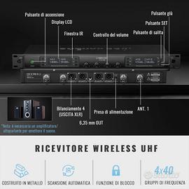 NUOVO IMBALLATO. Phenyx Pro Sistema microfono wireless a 4 canali con scansione automatica, 4x40 frequenze UHF, 2 microfoni dinamici palmari, 2 bodypack e archetto/da bavero per karaoke, canto, DJ(PTU-7000-2H2B) CCELLENZA WIRELESS: Sistema e microfono wireless UHF a 4 canali con frequenze selezionabili. Canale 1: 538,3 - 550 MHz (40 canali). Canale 2: 554,8 - 566,5 MHz. Canale 3: 571,3 - 583MHz. Canale 4: 587,8 - 599,5MHz. Utilizza la sincronizzazione IR senza problemi per accoppiare il ricevitore e i microfoni senza fili problemi in pochi secondi, con perdite minime e massima reiezione del feedback. Funzionamento a lungo raggio per sistemi microfoni wireless con una linea visiva di 290ft - 328ft. SCANSIONE AUTOMATICA PER LA FUNZIONE ANTIINTERFERENZE: il sistema microfonico karaoke wireless UHF è dotato della funzione di scansione automatica, che consente al microfono karaoke wireless di cercare il canale con meno interferenze per accoppiarsi con i trasmettitori. Il microfono inalambrico dispone inoltre di un'uscita mista da 1/4'' e di 4 uscite separate XLR. Il design a 4 antenne aumenta la capacità anti-interferenza e diminuisce le interferenze tra ciascun canale. COSTRUZIONE ROBUSTA, FUNZIONE COSTRUZIONE ROBUSTA, FUNZIONE MULTISET MULTICANALE: robusta struttura in metallo per il ricevitore wireless e i microfoni dinamici. Struttura di qualità per i trasmettitori wireless bodypack. I microfoni neri per cuffie e i microfoni lavalier con connettore mini XLR a 3 pin consentono di lavorare in modo professionale. Cartuccia dinamica cardioide e per un suono chiaro, robusto, ottimale e fedele. I canali 4x40 consentono agli utenti di selezionare le frequenze. CONTENUTO DELLA CONFEZIONE: ricevitore metallico wireless a quattro canali per il funzionamento a lungo raggio, 2 x microfono palmare wireless UHF, 2 x bodypack wireless UHF, 2 x microfono per cuffie wireless nero, 2 x microfono da bavero nero, cavo audio da 1/4'', adattatore di alimentazione, 4 x antenna, 2 x