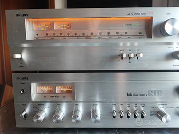 Vendo accoppiata vintage Philips della fine anni 70. Trattasi di amplificatore Philips hifi Sound project a 12000 e del suo tuner Philips 186. Oggetti in ottime condizioni estetiche considerando gli anni e funzionanti. Per quello che ho letto cercando In internet, questa serie è stata progettata in America dai tecnici Magnavox ( brand appartenente a Philips) e realizzati in Giappone. Derivano direttamente dalla serie hi end denominati Laboratory series. Usano componenti di qualità, i finali sono i stra famosi Sanken, gli stessi che monta il Philips 388, ( il 388 essendo più potente usa 8 finali mentre questo che eroga 65watts ne ha solo 4) . Le dimensioni e pesi sono notevoli, sono molto grossi e massicci. Le informazioni tecniche si possono trovare in internet. L'amplificatore ha 2 ingressi per giradischi, il sintonizzatore dispone di 2 uscite ,una fissa ed una variabile per un collegamento diretto anche ad un finale di potenza. Si possono vedere e provare al mio domicilio. È preferito il ritiro a mano visto peso ed ingombri ma si può valutare eventuale spedizione che rimane a vostro carico.