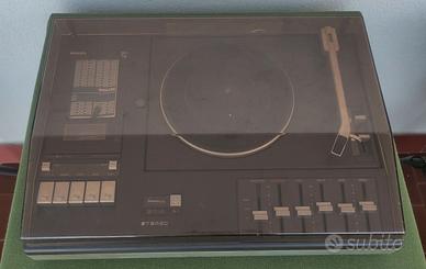 Giradischi piatto Philips modello GR 814 STEREO, vintage fine anni '70 made in Italy (?) con piastra di registrazione cassette. ATTENZIONE! NON FUNZIONANTE: se alimentato, la spia dell'interruttore generale si accende. Il piatto non gira, il motore del lettore di cassette gira ma il nastro scorre a fatica e si sente rumore di cinghie che slittano.