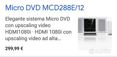 usato pochissimo poi riposto in armadio .micro theater mcd 288 E . mini home cinema con suffufer più due casse . uno surround ed effetti veramente piacevole x vedere film . chi fosse interessato mandi email o unrecapito saluti .ps completo di tutto il suo corredo .