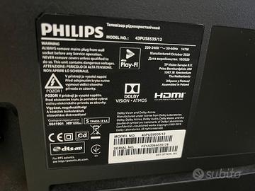 Marca: Philips Modello: 43PUS8535/12 Risoluzione: FHD/4K - HDR Dimensioni Display: 43” Led Ambilight dinamici posteriori Funzioni smart tv con app preinstallate: Netflix, Rakuten TV.
