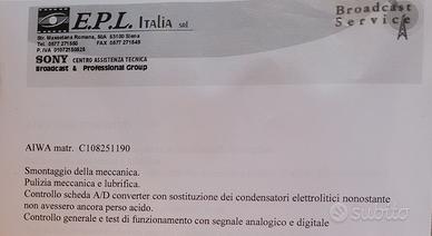 Vendo per inutilizzo (ne ho due identici) Aiwa XK-S9000 in eccellenti condizioni estetiche e meccaniche, con telecomando e imballo originale, corredato di attestazione di revisione: la piastra è stata controllata completamente da E.P.L. (Siena) con apposite verifiche strumentali (vedi documentazione allegata) nel marzo 2025 e usato davvero poco. N-O-N SPEDISCO: ritiro solo presso il mio domicilio con possibilità di prova. Prezzo non trattabile. Non accetto permute, no perditempo, grazie. Daniele Se non rispondo, lasciatemi un messaggio su WhatsApp, grazie. Di seguito le specifiche tecniche di una delle migliori piastre cassette mai realizzate. Type: 3-head, single compact cassette deck Track System: 4-track, 2-channel stereo Tape Speed: 4.8 cm/s Heads: 1 x playback, 1 x record, 1 x erase Motor: 1 x DC servo, 3 x DC Tape Type: type I, CrO2, Metal Noise Reduction: B, C, S Headroom Extension: HX Pro Frequency Response: 13Hz to 24kHz (Metal tape) Signal to Noise Ratio: 84dB (dolby S) Wow and Flutter: 0.018% Input: 50mV (line) Output: 0.53V (line) Dimensions: 469 x 151 x 415mm Weight: 14kg