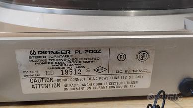 PIatto giradischi Pioneer PL 200X perfettamente funzionante e in perfetto stato estetico ed elettrico. Qualche piccolo segno sul coperchio. 33 e 45 giri con ritorno del braccio a fine disco. Testina Technics P27 nuova , cinghia ancora in buono stato.