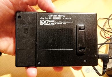 - piccola radio portatile Grundig City Boy 20, vintage anni '90, funzionante, dimensioni 6,8 x 10 x 1,8 cm, peso 97 g (con le batterie inserite), onde medie e MF, funzionamento con 2 batterie ministilo (non fornite), funzione stereo, colore nero e argento. Il coperchio del vano batterie si stacca facilmente, per cui è stato utilizzato un pezzo di scotch per tenerlo fermo e si notano tracce di colla. Sul retro, la linguetta che serviva per attaccare eventualmente la radio ad un capo di abbigliamento è andata perduta.