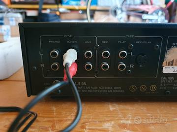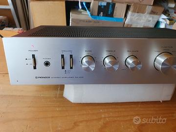 Vendesi amplificatore Pioneer SA-408. Completamente revisionato e pulito e come si vede dalle foto è in buonissimo stato e suona bene. Sono stati sostituiti gli attacchi a molla per il collegamento delle casse con dei più affidabili attacchi a vite/banana. Presenta un piccolissimo segno nella parte sinistra in basso, visibile in foto. Nota: gli attacchi a vite risultano più grandi dei precedenti e quindi non è stato possibile montarne quattro. Quelli presenti sono collegati al selettore A delle casse. Il selettore B delle casse risulta pertanto non funzionante. Disponibile la prova in loco senza nessun impegno.
