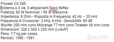 per esubero elettroniche si cedono casse vintage ( ma immacolate come da foto ) del celebrato marchio nipponico - vendita fra privati con formula visto e piaciuto ; possibilità di prova di ascolto presso mia abitazione - per dimensioni e peso non prevedo spedizione - possibilità di consegna su BO/MO/FE con sovrapprezzo 10 euro - se annuncio presente oggetto disponibile , grazie , saluti