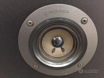 PIONEER CS-777 coppia diffusori a tre vie con piedistalli originali dedicati realizzati dalla Pioneer, risposta in frequenza 45<20 khz, sensibilità 90 db, crossover medi 2000 hz e alti 5000 hz, dimensioni trasduttori woofer da cm. 20, mid da cm. 7,7, tw da cm. 6,6, dimensioni senza stand cm. 30x52x23 , peso kg. 7 , anno produzione serie 1984, reflex posteriore con morsetti a molla, finitura legno nero opaco con pannello frontale lati stondati, bobina mobile woofer in lega leggera , fissaggi altoparlanti tondi con scritta originale Pioneer, piedistalli con uguale finitura legno nero opaco. Condizioni ottimali dei trasduttori, pochi piccoli segni sui mobili.