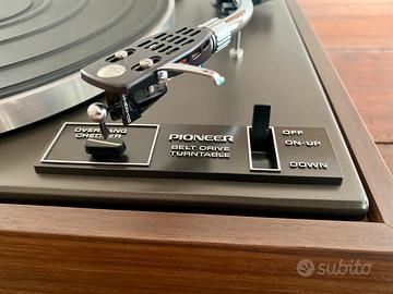 Equipaggiato con una rara e prestigiosa testina Stanton 681EEE completa di stilo originale (in perfetto stato) e pennello Longhair di pulizia solchi. Headshell e adattatore 45 giri entrambi originali Pioneer. Braccio a S con contrappeso regolabile aggiuntivo di serie.