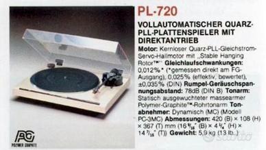 Propongo giradischi Pioneer top di gamma della linea “20” controllato al quartz in buono stato estetico e funzionante, full automatic con start e stop , repeat traccia , speed 33/45 giri , ottimo braccio antirisonante , completo di testina audiotechnica con testina rimarchiata philips gp-780 in buone condizioni, cappa con qualche graffio di rilievo .